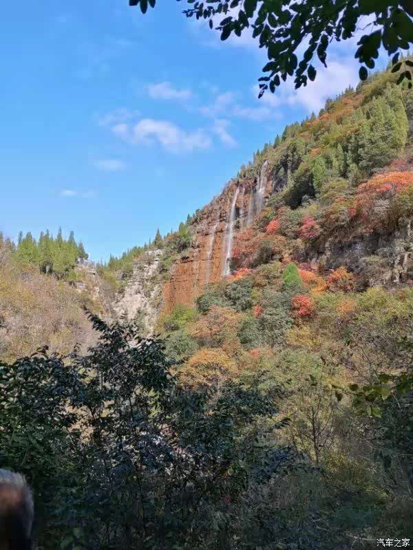 秋天到了,树叶黄了,远处瀑布飞流直下。