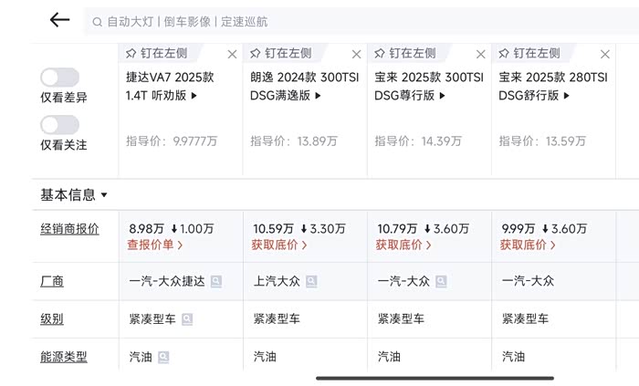 十万落地,大众朗逸宝来和捷达VA7很纠结