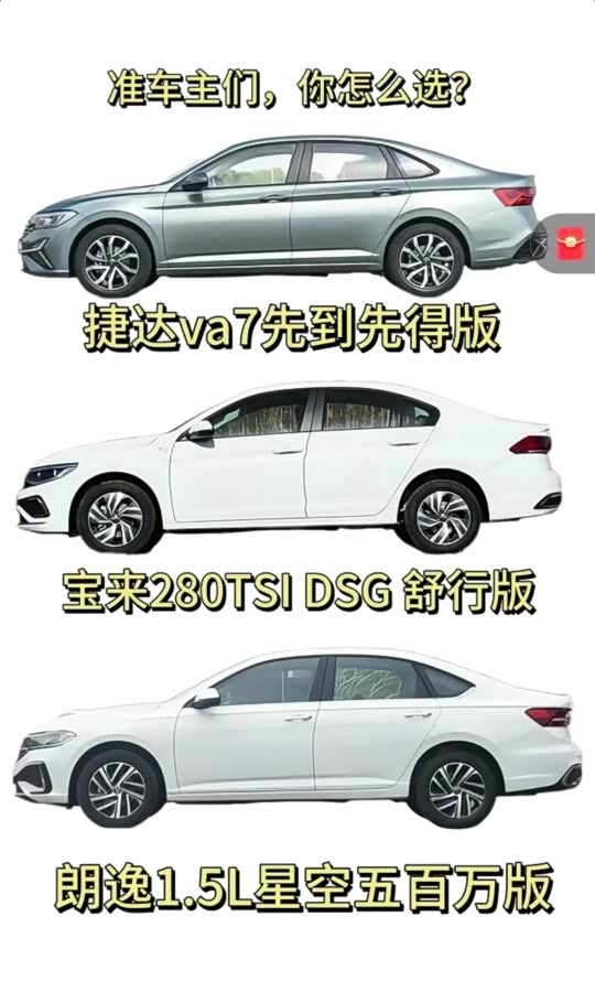 朗逸宝来捷达VA7三选一,三个车大差不差都是同级别,宝来朗逸牌子硬知名度高1.5t,销量常青树,捷达VA7车更大独立悬挂1.4t,没几个人认识,而且现在还没销量口碑没出来,简直太难取舍了,各有各的优势~还不如大众一个价位就出一个车不用想那么多.
