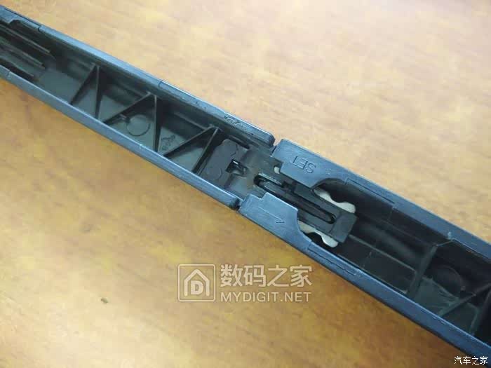 雨刮三节的连接结构,有SET标识,和箭头。指示安装的方向,从这一端抽出旧胶条,也从这一端插入新胶条。