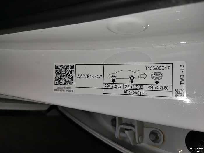 车门边有标牌写着轮胎的参数和胎压要求