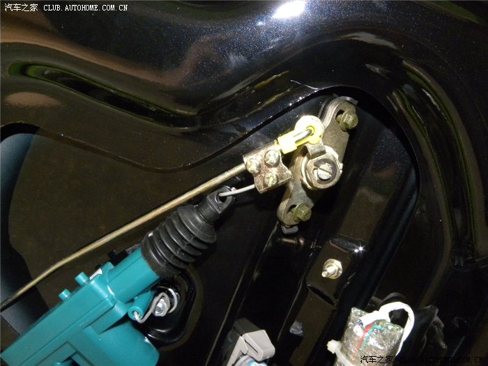 3.将中控锁拉杆与原车钥匙拉杆平行固定,注意中控锁的锁舌一定要全部拉出再锁紧螺丝.并用手拉一下是否灵活.