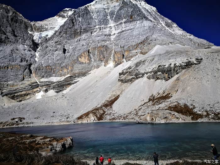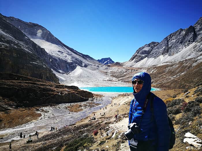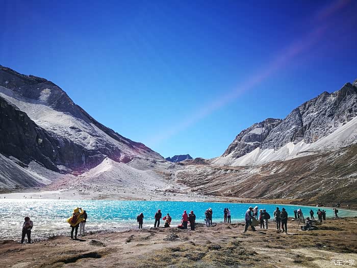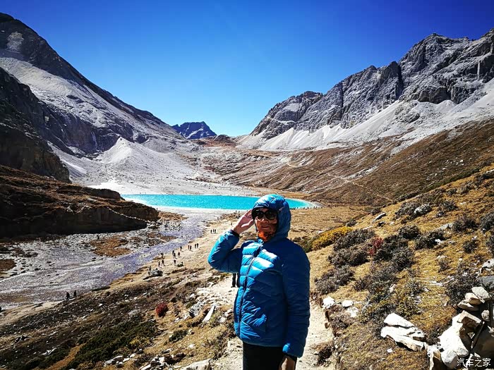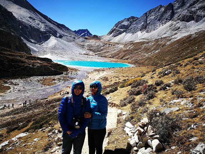五色海又名登崇措,五色海由于光的折射下,产生五种不同颜色而得名:其真名为"单增措",它位于仙乃日与央迈勇之间,海拔4600米。我们走到了她的身边。