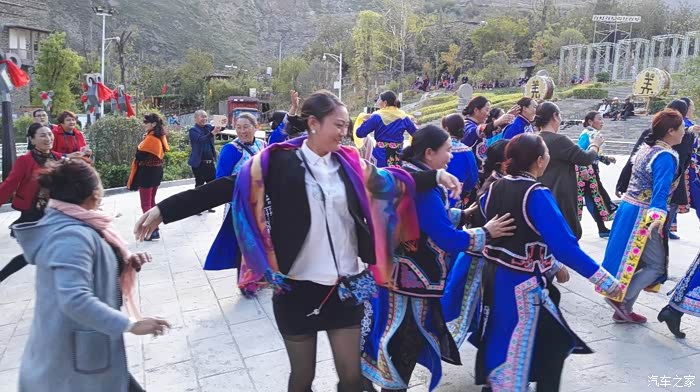 此次在新羌寨的广场上看到排练歌舞的羌族男女。