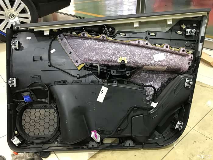 中间一层也需要拆下来,左上角白色的就是锁块了。拆到底也没有发现门板上有隔音棉,难怪车速上到120说话就要靠喊了。
