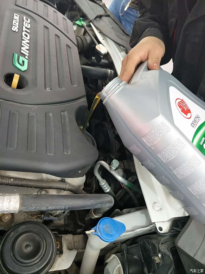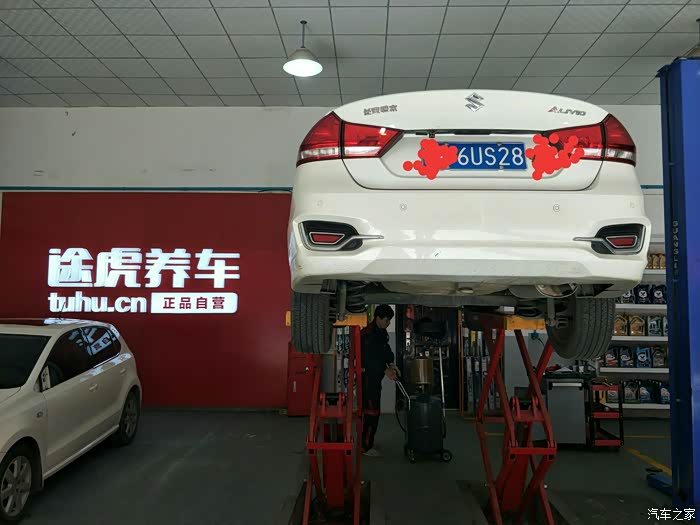 师傅正在给爱车换油,车牌还是稍微遮挡一下。