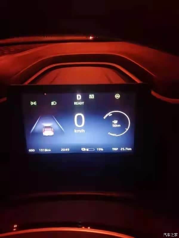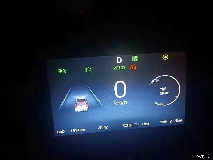 从峄城出发,上车通电后仪表盘显示里程数为 TRIP 21.9km ,只有19%的电,