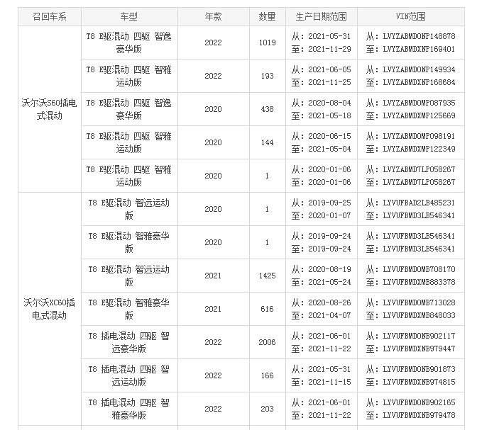 沃尔沃XC60/S90/S60/XC90插混车型召回