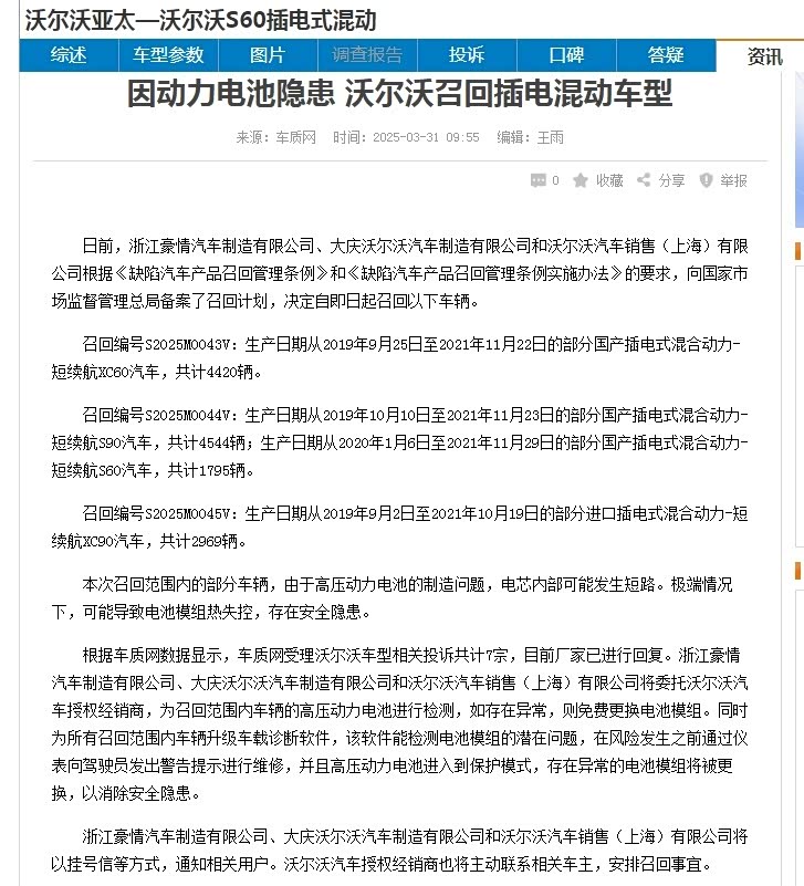 高压动力电池内部可能短路 沃尔沃T8插混车型召回: