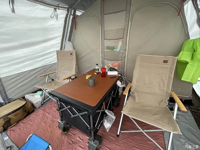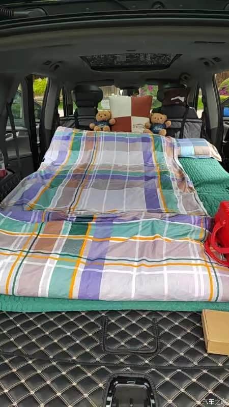 那些都是小儿科,看看我解锁的一个新功能--“房车模式”。哈哈,不过此“房车”非彼“房车”,我们把第三排座椅放倒后形成了一个平整的区域和后备箱连通,铺上床垫之后睡两个人没问题。露营需要的帐篷我们也有带,不过车上也要充分利用起来,愿意住帐篷的就住帐篷,愿意住车里的就住车里。小孩们就喜欢住在车里,因为可以看《汪汪队》.......