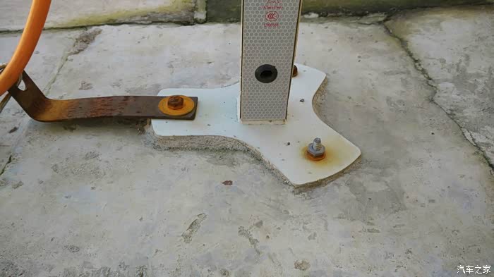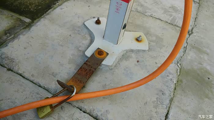 电桩安装,在地上摆好后分别在三个孔位置上做好标记,用钻头打好孔,然后在摆上电桩用10个或者8个的膨胀螺栓固定,那个长长的贴片是我自己做的,两头打孔一头固定在电桩上,一头用来锁住充电线,基本防君子不防小人。