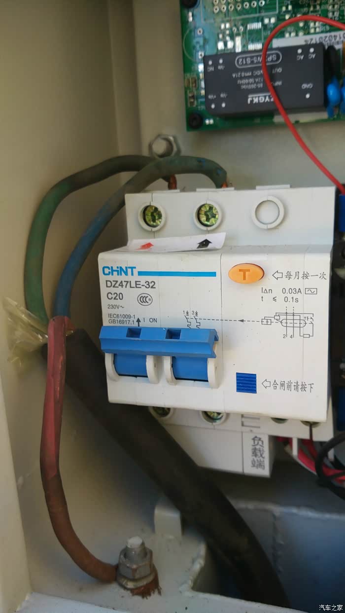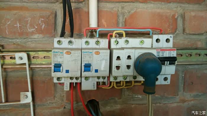 漏电保护器特写,最左面的是电动车的黑线入,红线出,右边的车座我用来冲自行车,各种省。