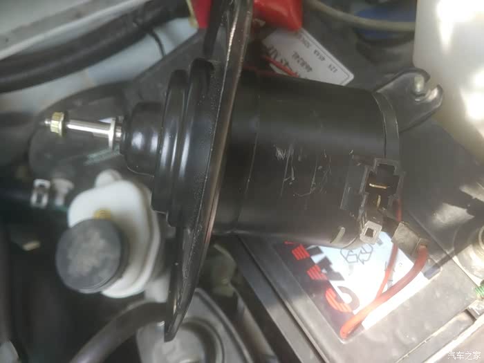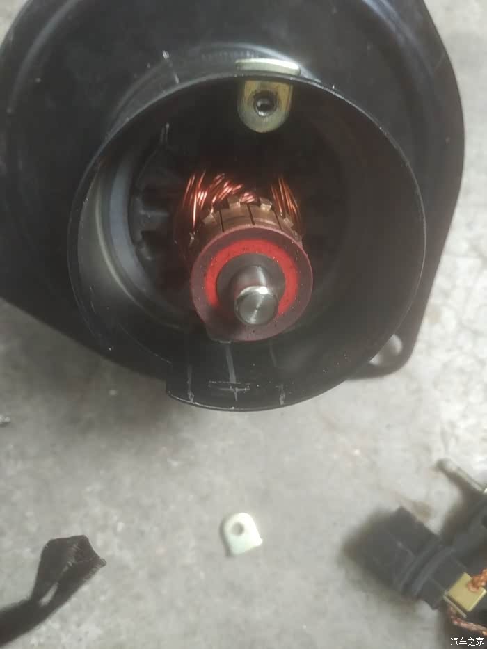 拿出后去电瓶接电测试,第一次能转动,断开再试又不转了,考虑电机线圈应该没坏,可能是电枢烧蚀或碳刷接触不良,电机上只有两根线, 直流电机可以不考虑正负极,接错了就是反方向转。装车是插头是绝对不会让你接反的,反了插不进去。