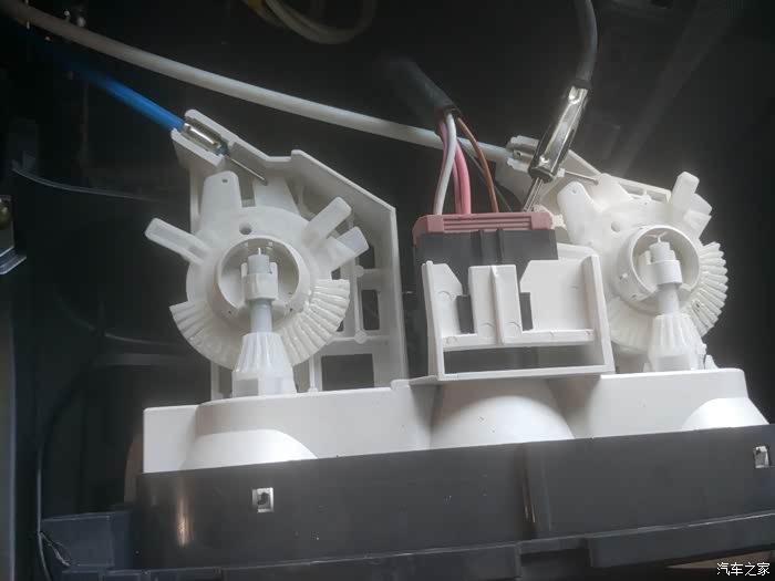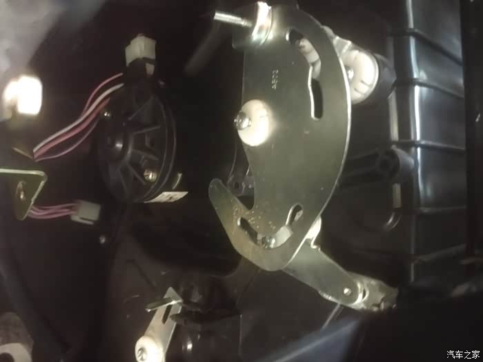 出风口位置链接机构,其实很简单,一个钢丝套一个卡子,卡子卡钢丝外皮,钢丝顶端的套套在轴上,不明白就趴在方向盘底下侧脸一看就知道了。图左侧的就是暖风电机了。