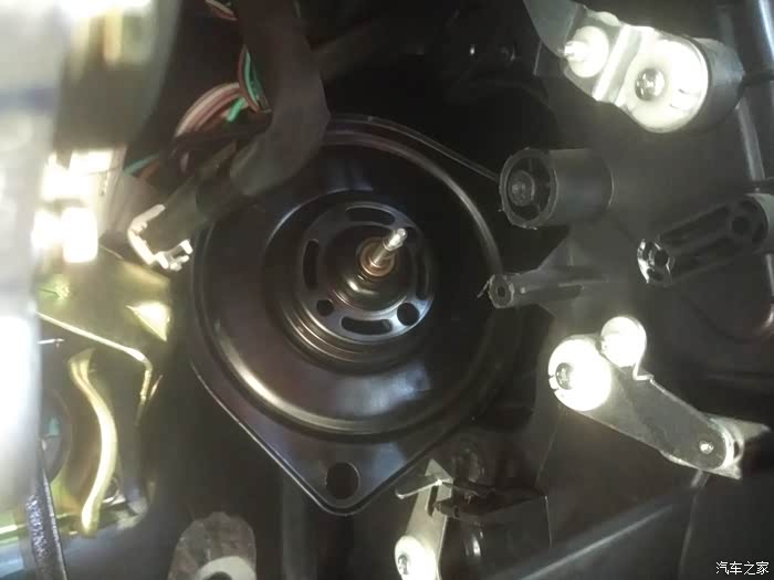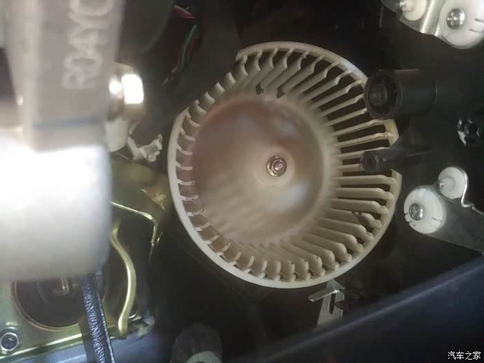 这就是风机的叶片,当时想整个拿下来,但空间太小,怎么摆位置也出不来,差点就拆刹车真空助力器了,最后拆掉叶片的固定螺母(8号扳手)才拿下来,细心的朋友应该能看到扳歪的制动灯开关支架。