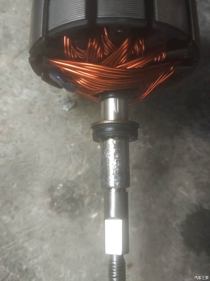 这就是转子,拆下来后再把尾端的轴向间隙调整垫片和绝缘垫片拿下来,绝缘片就是那红色的垫片。尾部那个铜色的就是电枢,看到电枢和碳刷的接触面积很小已经烧蚀了一道印痕了,用细的砂纸打磨电枢,要用手转着打磨呦,这样才能保证打磨出来还是圆的。