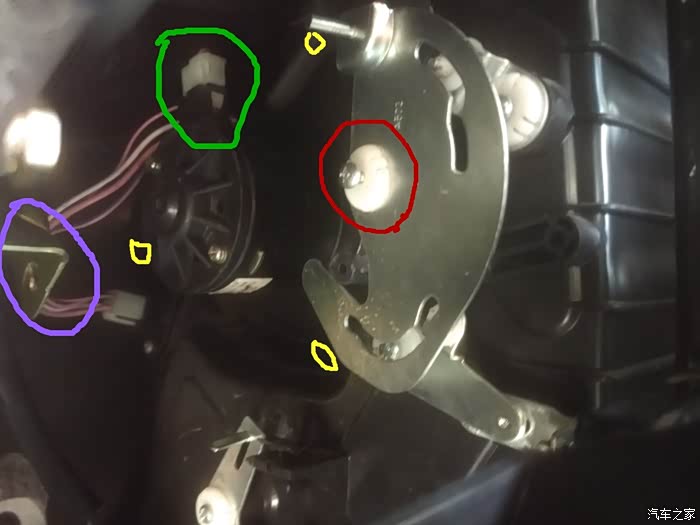 爬方向盘下面能看到暖风电机,一个人干活没来得及拍照,因为姿势太难了,跪着也不舒服躺着也不舒服趴着也不舒服......用这张图说明一下吧。黄色的圈圈是固定电机三条螺丝的位置,用十字改锥拆装,红色圈圈是固定出风口位置连接机构的导轨,我怕不好拿出风机把这条螺丝也拆了,把导轨片拿下来空间还大些,绿色圈圈是电机插头,里面两根线,一个绿色常有电一个粉色至暖风开关,插头旁边的那几根线是通往调速电阻的,电阻坏了123档都没风,只有4档有风。紫色的圈圈是制动灯开关的支架,当时我怕电机不好拿出来,把支架掰的向车门侧倾斜了,过后又扳了回来,也许不用扳歪就能拿出来,支架很薄的铁片,可以无损恢复,这个制动灯开关支架和刹车真空助力的后支架是一体的,当时拆不下来我都想要把真空助力拆了,后来拆了风机叶片才没拆那么多零件。