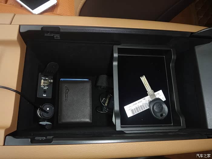 中央扶手箱打开盖子以后可以看到分成两层,上面一层可以放手机和钥匙,下面一层空间还是够大,可以放几瓶饮料,还有两个USB接口,一个音频接口,一个点烟器接口。