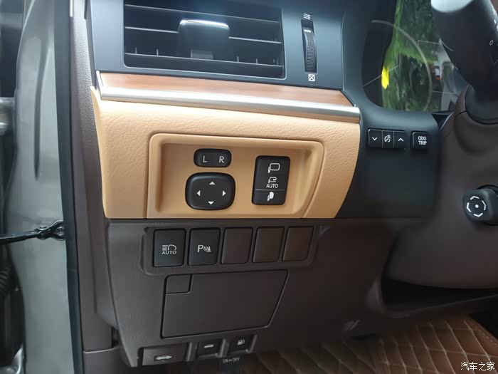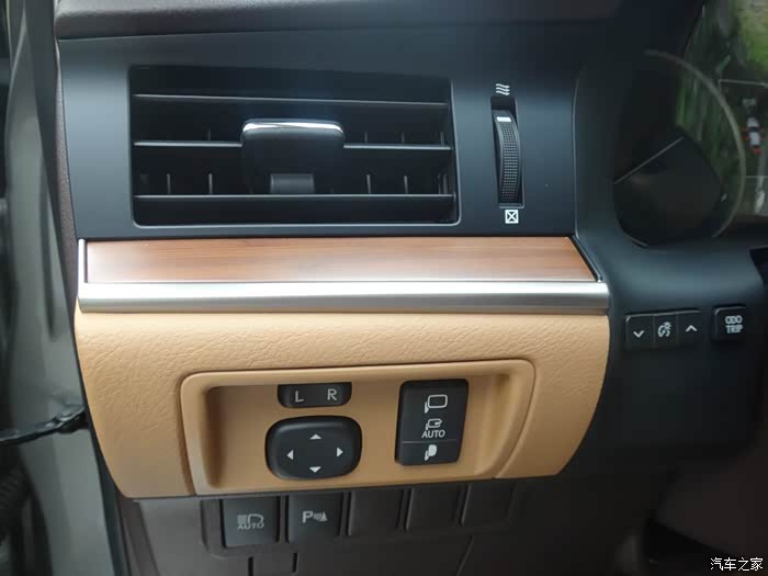 后视镜调整按键,如果把左右后视镜选择按键随便按下一个(左或右),倒车的时候,后视镜会自动下翻,右侧的是后视镜折叠手动调节键。再下面一排是大灯远光自动规避,被我关掉了,对于不守规矩开远光的只能选择照回去。下面那个小的手扣能放零钱和卡片,最下面的是引擎盖、后备箱和油箱盖按键。