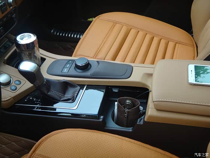 排挡杆附近有两个水杯位置,都有按下去就翻转的盖子,主驾驶这一侧的盖子是钢琴漆的,副驾驶那边的是水晶粽的塑料材质。那个多媒体选择旋钮手感不太好,塑料感十足。