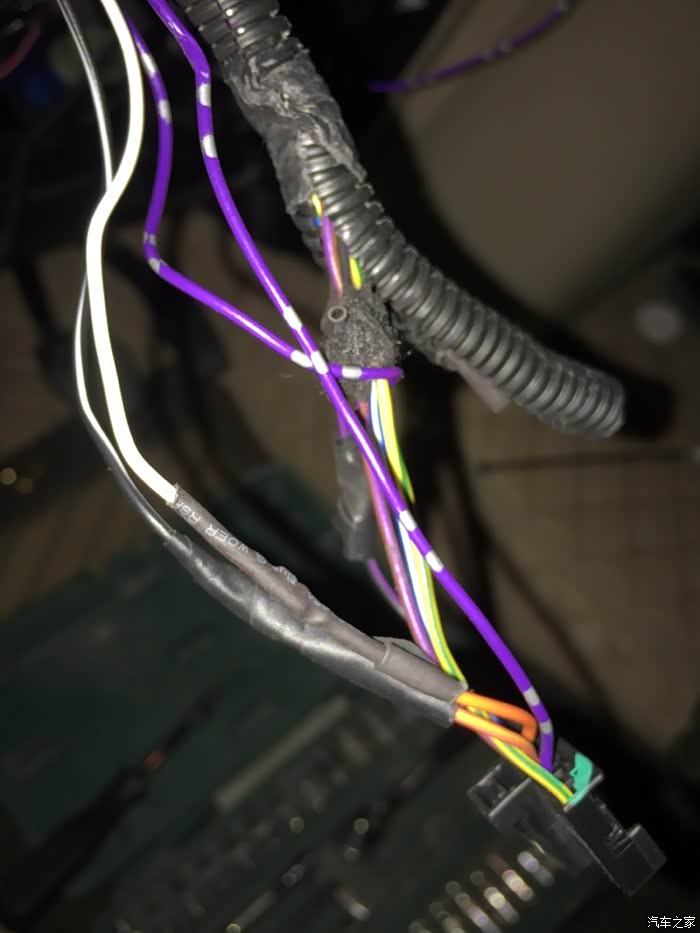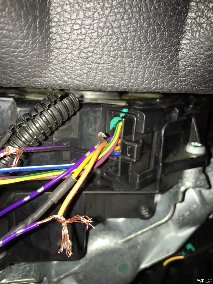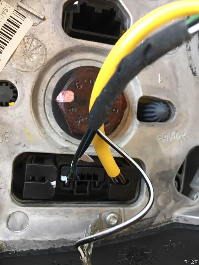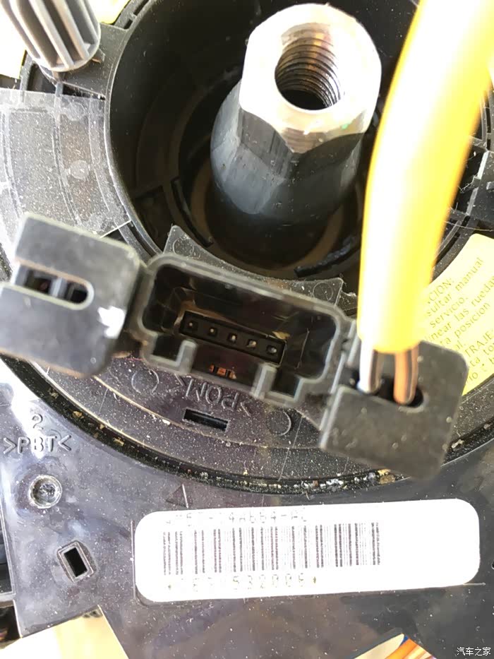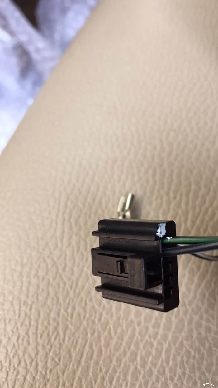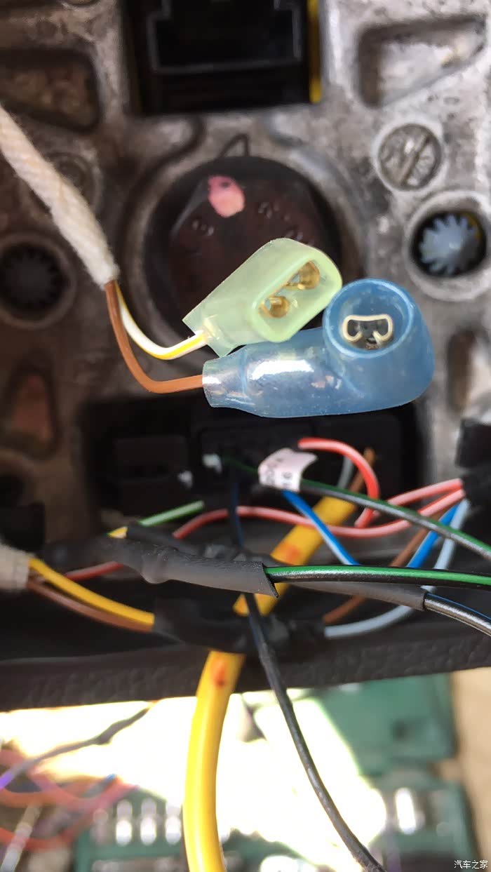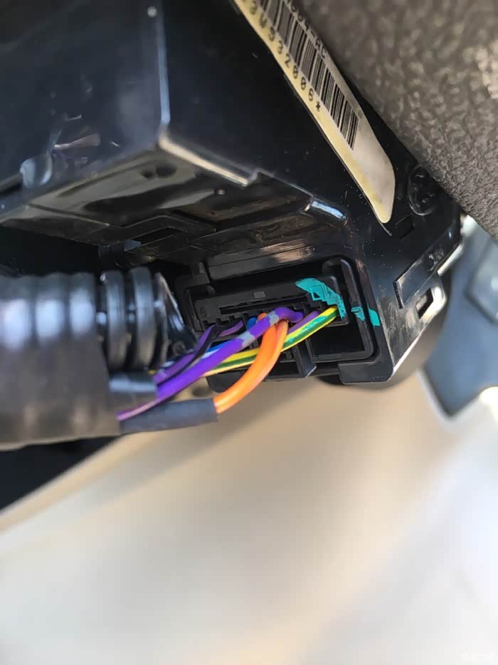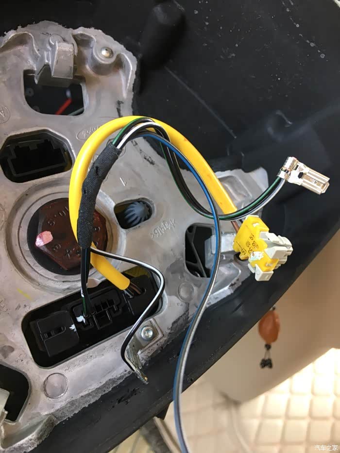 这两个线束就是多功能方向盘要改装的插头,记住不是黄色的那个。有五个插孔的那个才是你要接线的位置,改装的途瑞欧方向盘里面有三根电线插在这五个插孔的三个空位里面,一定要记住你插的三根线是干什么用的