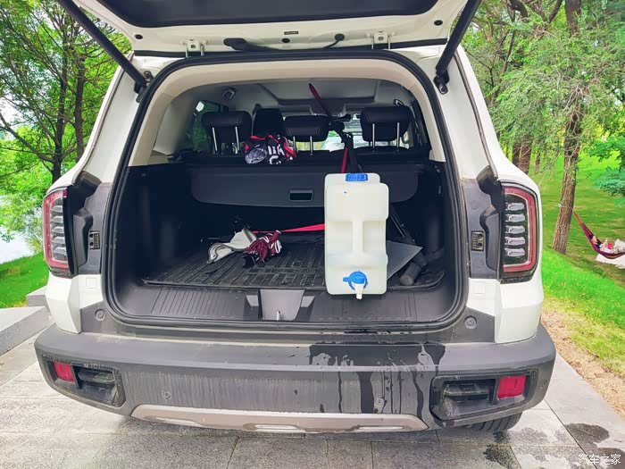 大狗这个车底盘高,后备箱的高度就更高,水桶放在上面,孩子洗手很方便。
