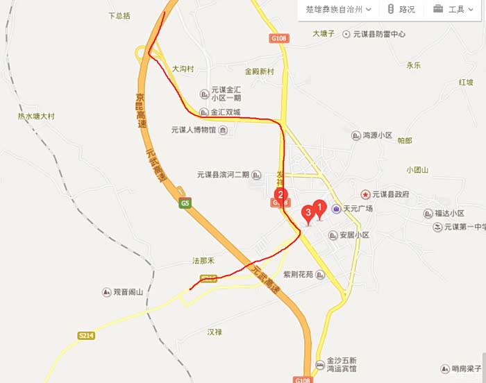 到元谋的路线,元谋人博物馆和凉鸡店(有几家,我去的2那一家,外面看着只有个小铺面,进去了可以摆婚宴了!)然后走s214到楚雄。二级公路