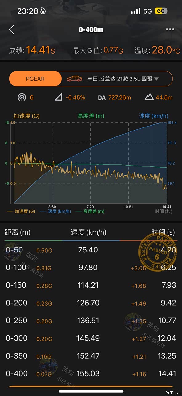 轮胎我把235/55r19换成了235/60r19,轮胎直径变大,测试成绩会比55扁平比轮胎要慢一些