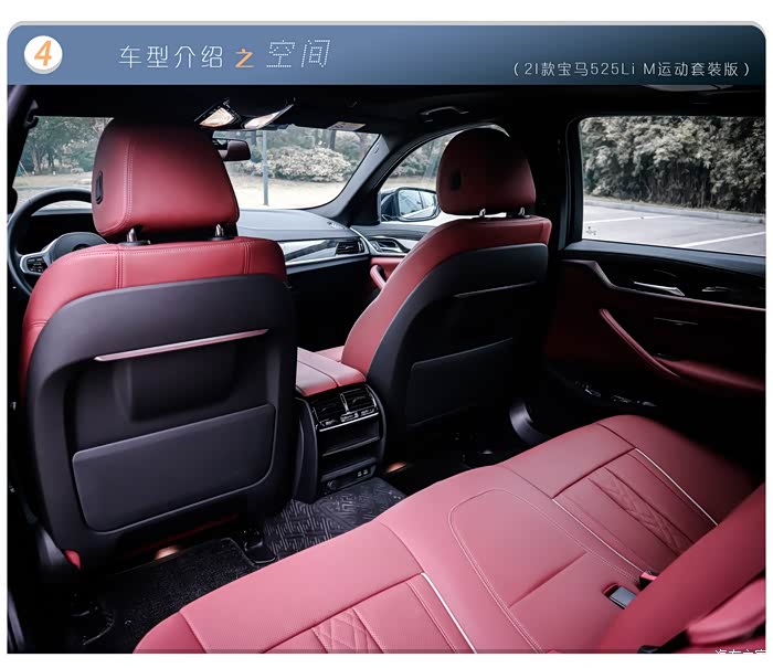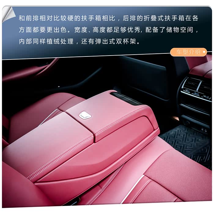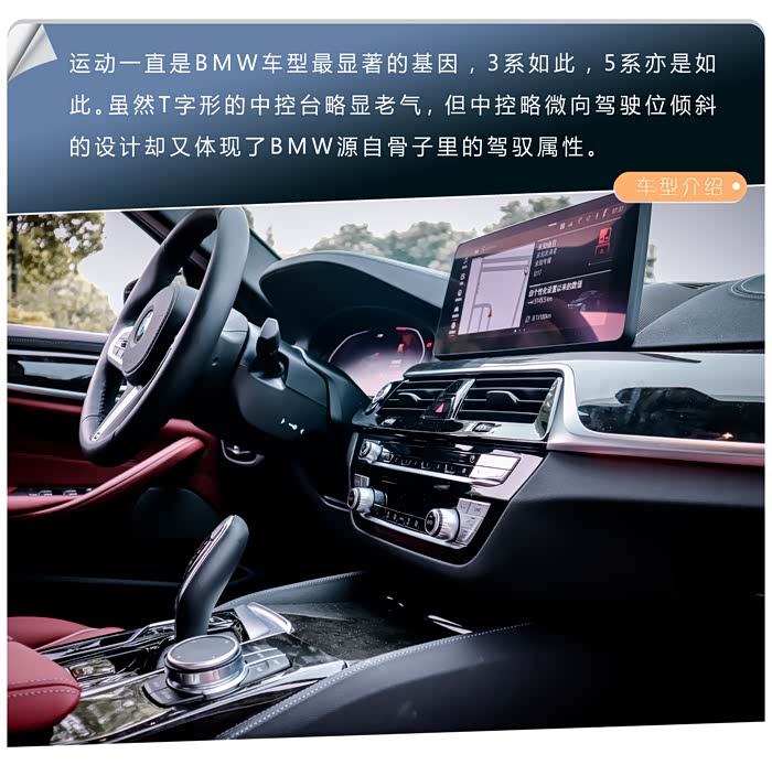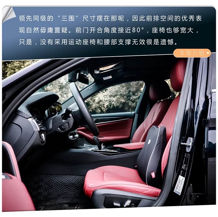 这代5系的内饰并没有进行大换代重新设计,依然沿袭了前代的设计语言,甚至与更早一些的5系车款在中控台布局上也没太大的差别。这也是我之所以称之为内装,而非内饰的原因。打开车门,放眼望去,处处都是熟悉的宝马味道,T型中控台,造型不可谓不经典,亦不可谓不老气;银色饰条、银色贴片按键、钢琴烤漆面板、木纹装饰板等等材料的使用,并没有特别高级的地方,好在做工以及装配水平不错,豪华感不敢说有多高,但精致感不错。当然,都2021年了,双12.3英寸大屏,支持OTA远程升级的id7系统等科技配置没有在5系上缺席,都是标配,这点值得表扬。作为一个专注运动的豪华品牌,BMW对于红色是钟爱的,火山红的内饰配色够大胆、前卫,虽然全系都只是仿皮材质的座椅,但不得不承认BMW是一个能把材料价值发挥到极致的高手,这一通操作、搭配出来的5系内饰,让你不能全面否认它的豪华感,若没有竞品车型更豪华的内饰摆在那的话,相信我们会对5系的内饰豪华感称赞有加的。当然,因为我的车型是入门版车型,因此在内装配置上相对有限,比如6喇叭寒酸的音响,比如落伍的双区独立空调等等,确实拉了5系的后腿。看来限制我对5系更豪华的、更好的内饰体验感受的只是我的钱包吧。