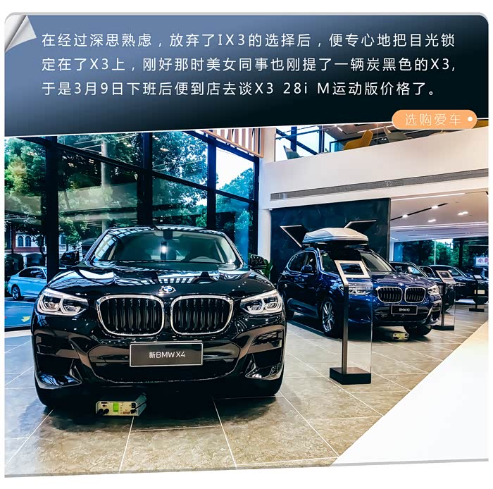 此时,在我面前的选择范围其实十分有限了,因为我决定就在BBA中选一辆40来万的SUV了,所以只有奥迪Q5L和宝马X3 28i了,是的,你没看错,我还是没考虑奔驰GLC,倒不是价格,或者网上GLC的一些负面因素,而是我感觉奔驰太高调了,不太适合我(或许这也是吃不到葡萄说葡萄酸的心理的一种表现吧)。最终把我推向宝马的是奥迪,因为我看中的Q5L 45运动价格始终谈不下来,而且又没现车,而销售却几次忽悠我去店里谈,这让我感觉奥迪的体验不是很舒服了,于是只有宝马X3 28i了。有现车,颜色也有白色、蓝色、炭黑可选,3月9日傍晚到店的,价格也都谈下来了(也是没有试驾,没有走第二家店比对价格,看我这个猴急啊,汗!),谁知会被停在旁边的那辆待提车的525Li M运动套装版给吸引了,得知落地价格只比X3贵1.5万后,我的买车初衷便开始出问题了,不再非SUV不买了,不再考虑配置了,前后不过15分钟的时间吧,最后天平彻底倒向了5系那一侧,于是当天付了定金,提交了贷款审核,3月11日又去把尾款、保险都付了,自己回家网上交了购置税,网上选择了车牌。3月12日放店里做装潢,3月13日便和老婆一起把它提了回来,整个提车过程乏善可陈,就不多说了。