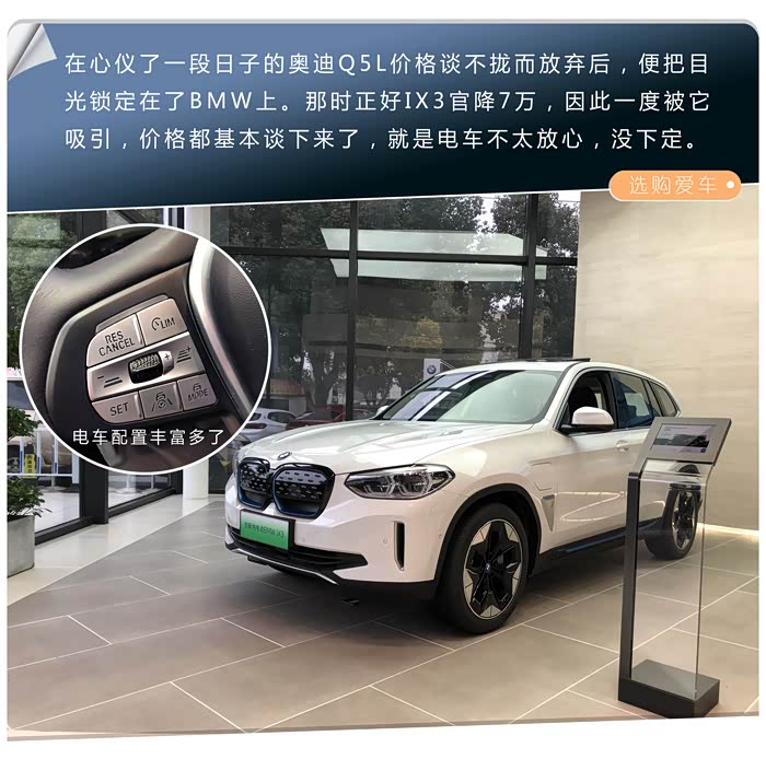之所以一开始奔着特斯拉而去,一来那时正好model Y大降价上市,二来我正好考虑买辆SUV,家里也有条件安装充电桩,因此就心动了。然后发现model 3 Performance的价格和model Y一样,试驾后发现不到4秒的0百加速确实感人,只是同时也确实发现了特斯拉的内饰用料,钣金做工等等确实很一般,另外就是我的性子比较急,而特斯拉这两款车型都是要等几个月才能提车的,因此就没着急下定。不过这个看车的头一开就刹不住了,于是开始了漫无目的的看车之旅,奥迪、宝马、沃尔沃、凯德拉克都去看了,也试驾了几款对我眼缘的车型,应该是都各有特点,也各有不足。XT6个头我喜欢,6座布局很适合我家,就是那刹车确实太差劲了,踩下去有种刹不住的感觉,最接受不了的是有低频共振问题;V90的外观、内饰,还有齐全的安全辅助驾驶配置我是真心喜欢,可惜超过45的价格,还有就是也有低频共振这个问题,只能无奈放弃;奥迪车型看了不少,只试驾了Q5L,外形蛮喜欢的,内饰也还能接受,论坛上一翻,发现吐槽双离合的蛮多的,还有四驱系统似乎报错的也不少,加之那段时间改款Q5L又即将上市了,遂一大圈下来还是没有要定下来买的激情,很奇怪的是那段日子就是没考虑过去看看奔驰。期间正好iX3官降7万,也去试驾了,感觉其实还是蛮好的,当天还坐下来大致谈了下价格,当时店内还能优惠2万多,就差付定金定下来了,就是不知怎地睡了一晚后,对于电动汽车的种种疑虑占据了绝对上风,似乎突然想明白了,我需要的不是电动汽车,还是再买一辆燃油版的SUV吧。