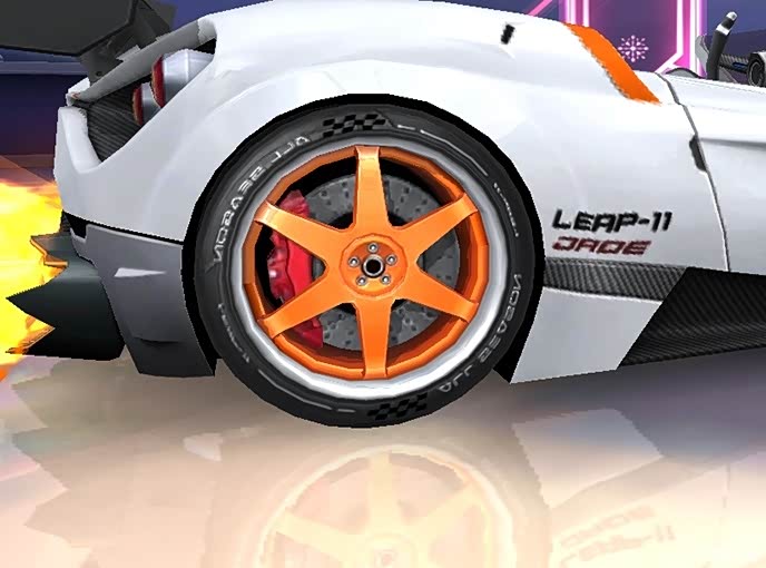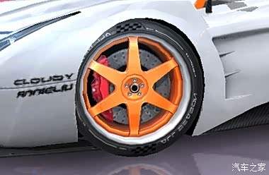 六福轮毂同样是橘色喷漆,白边是点睛之笔,还有白色的轮胎字,视觉效果十分到位。前刹车目测为六活塞,但游戏中我们好像几乎用不到刹车