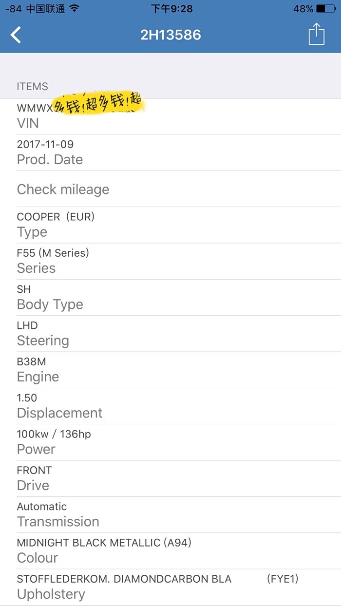 自己订车时去网上查车架号不会查,付费下载了一个宝马的车架号查询APP,挺靠谱的。有需要的朋友可以私信我查,不要钱不会透露车架号,纯属混了这么久论坛,从啥都不懂的小白,到看大家的帖子自己选车型了解mini,也算为论坛做点小小贡献