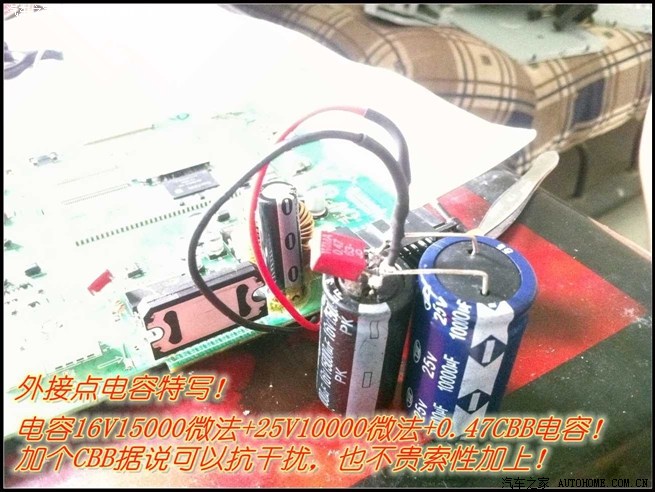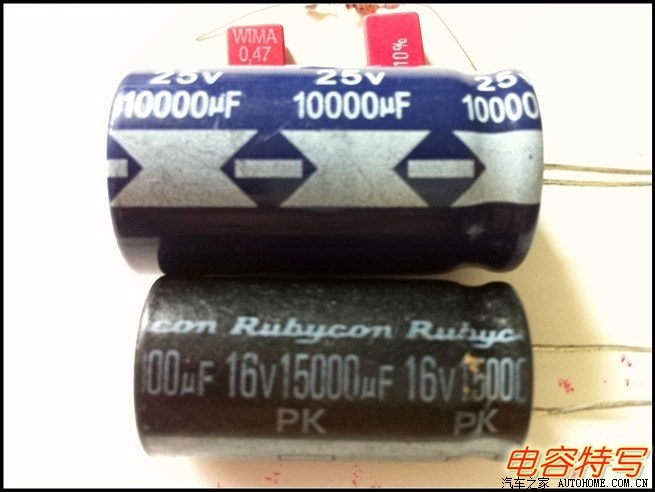 原车的电容使用的25V2200微法的电容 蓄能少。所以既然升级就一定要增加电容的容量,使得功率游刃有余。所以选择了增加一颗16V15000微法和一颗25V10000微法电容,以增加容量 更好的蓄能,更好的推动音响!