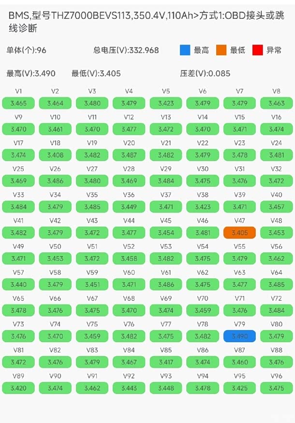 再看另一幅图,它展示的是电池充满电时的单体状态。电压最终稳定在402.416v,而79号电池始终保持着最高电压,当充电达到95%时,其电压已接近4.23v,从而触发了满电状态。