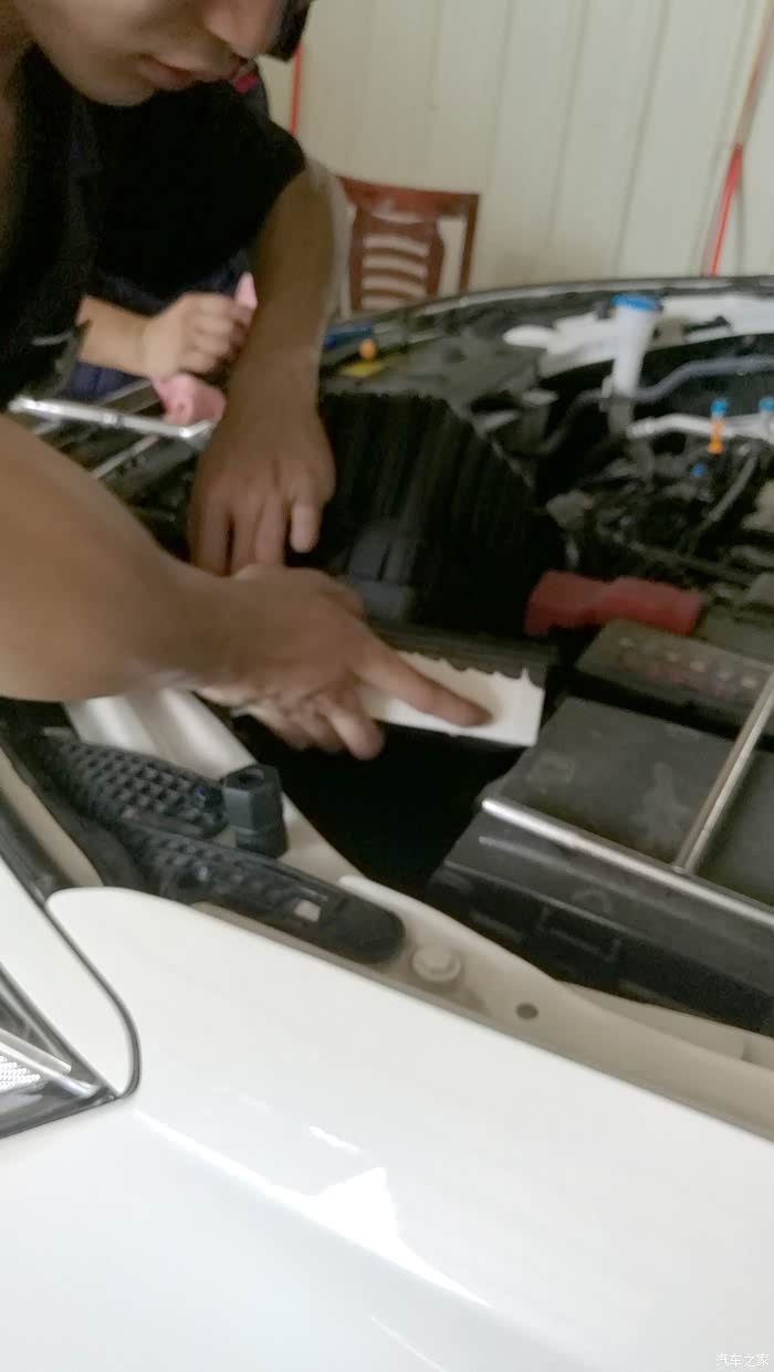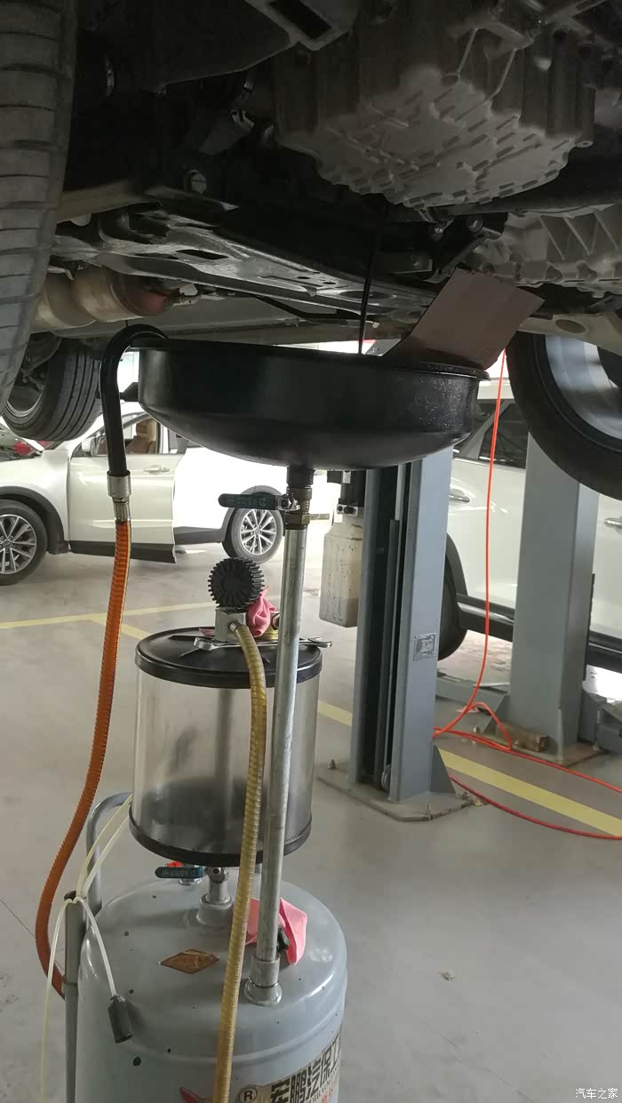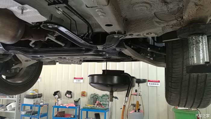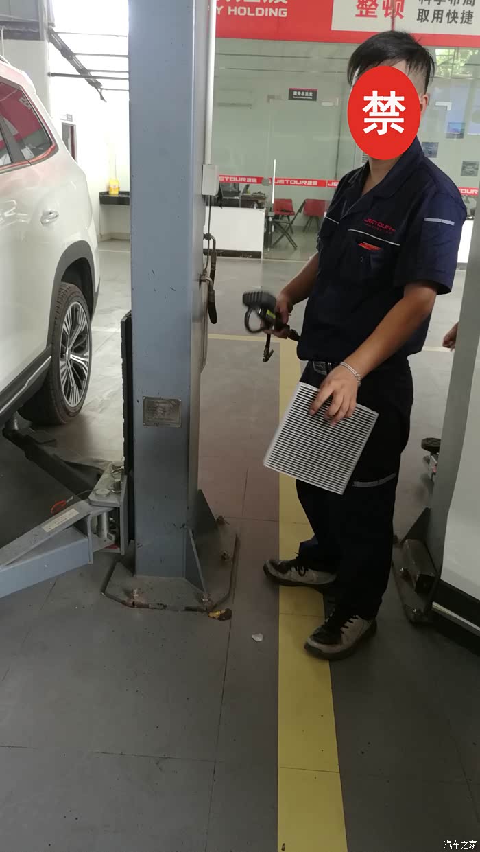 当天早上出发,中午11点15分左右到达市里唯一的捷途汽车售后服务中心,与客服靓女简单做了保养登记后,就直接交车进厂做保养了。这家捷途汽车售后服务中心位于市区里面,交通方便,汽车导航可以直接导到终点。只是无论从外观上看还是厂里面的的布局都显得有点儿简陋。客服靓女蛮热情,端茶递水,服务周到;师傅们做事有条不紊,手脚麻利,动作娴熟,只是感觉有点不太爱理人,而且在做保养时也没有完全按照操作规程进行操作,比如在对车子保养时没有给车子座椅穿上保护衣,更换机油时没有给发动机仓及前挡裸露部位盖上干净的保护垫进行保护……等等,车子进厂后直接上机位,打开发动机仓后直接就拆机仓遮挡板,拆油滤,放机油,放机油过程中还对车子轮胎进行了胎压检查补气,放完油后给放油螺栓换上了新的密封圈并拧紧,换上新油滤后就开始加新机油,4.5L一桶的加完刚刚好。还检查并清洁了空气滤芯及空调滤芯,最后师傅提了一个有点儿脏的桶(上面明确显示着是发动机冷却液)给车子玻璃水箱子加了点液体,当时我问了一下师傅说是玻璃水,但个人当时看到的感觉像是自来水,并不是专用玻璃水,玻璃水不应该是发动机冷却液的桶装的吧??!!首保的整个的保养过程大概也就不到一个小时就全部完成了,发动机仓盖上和前档面板上还有点儿油污也没有擦拭干净,车子保养完成后也没有给我清洗一下车子(其他来保养的车子也是没有得到洗车服务),唉,只好自己动手清洁擦拭干净,感觉这里做的保养有点儿马虎啊!!!