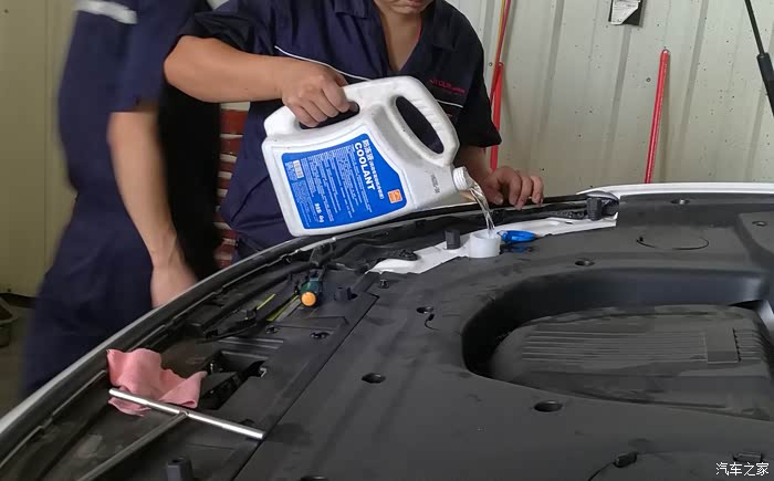 补充玻璃水。大家注意一下图中塑料桶上的文字——发动机冷却液!水是白色透明的,问师傅,说是玻璃水,但我觉得应该只是自来水!!!