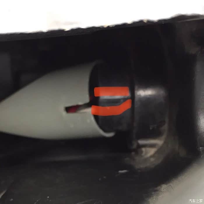 一定注意,白色管子不要动,我就是白费了半天,结果拆了也没用!直接用螺丝刀,拨两红色线中间的黑色凸起,面对车头,向右拨动约45度,会看到松动了,然后用螺丝刀轻轻向外一挑就出来。由于很难伸手进入,需要那个铁丝(最好准备长镊子)将灯泡钩上来,拔出灯泡换上即可。