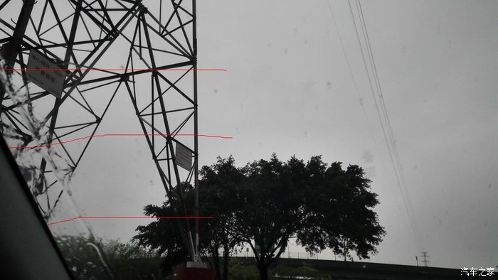 更严重的是如上图,我红色线标出的地方,由于我每天都开雨刮喷水除尘,所以前挡的镀膜破坏了,那几条红线就是雨刮过后出现的很明显的水印,不是雨刮磨损后的那种细丝,是一条很粗,约1.5cm的极细水珠带(由于天空颜色光线问题,手机拍了好几张拍不出具体明显效果,但是开车的视线刚好被档),就是镀膜层破坏后原本溜水属性变成了粘水,而且是比原本没做镀膜前的玻璃更粘水!