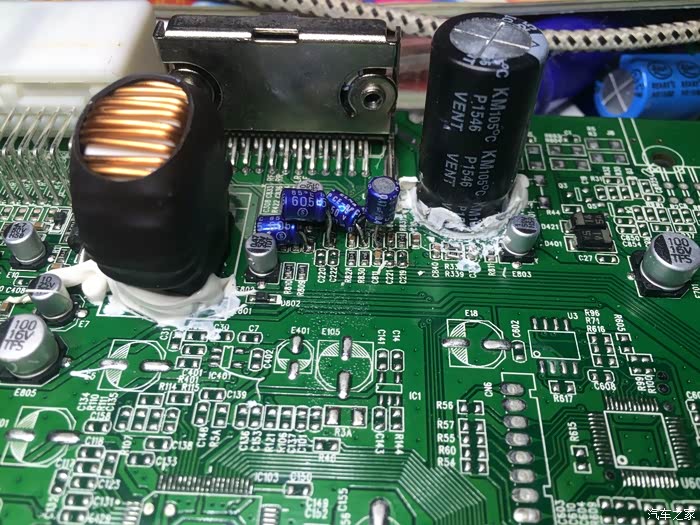 焊上35V10000UF音频专用电源滤波电容。图中右侧有2颗蓝色的电容,是AUX通道上的耦合电容,也一起换了。
