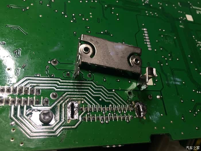 然后烙铁加热一只脚,退出来一点,再加热另一脚又退出来一点,来回几次,就能把铁片支架退出来了。