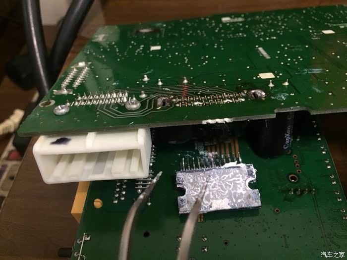 重点来了,改功放。先用吸锡器,把功放IC固定铁片焊点的锡吸走,拧直铁片卡扣。
