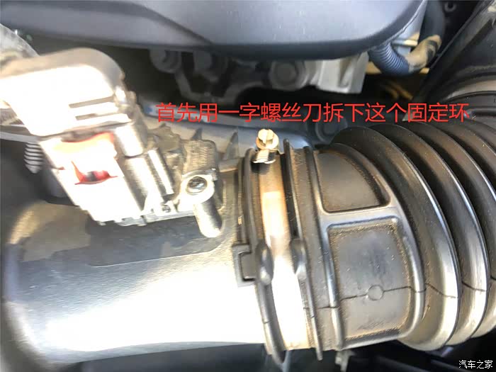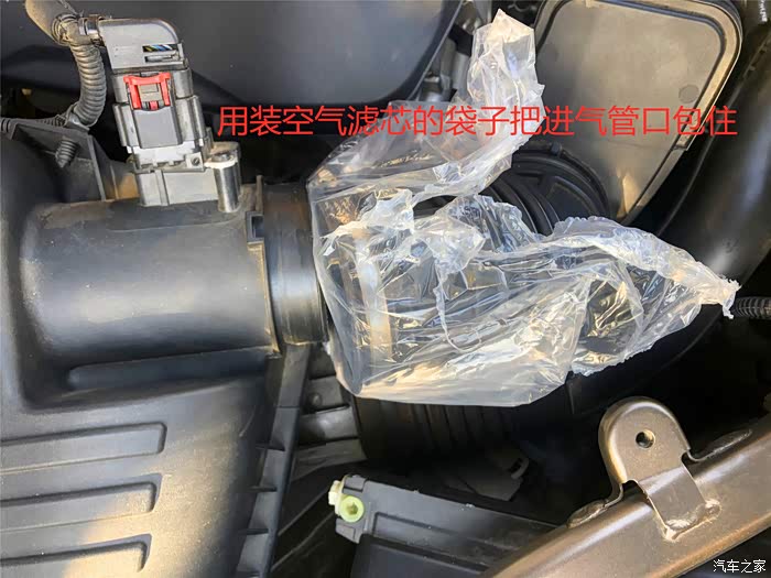 2、首先卸掉进气管卡扣 ,顺便用装空气滤芯的塑料袋套住进气管口,防止灰尘进入。