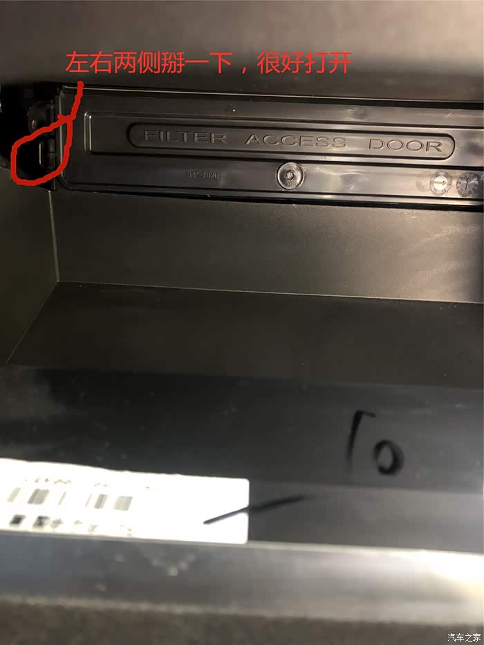 4、手套箱卡扣打款后,就能看到空调格盖板,轻轻一掰就打开了。