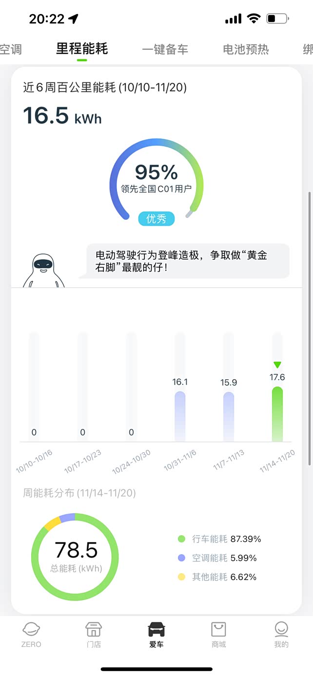 #黄金右脚挑战赛第二季# 关于近期提C01 的717 版本的能耗表现。大致说下我上班通勤25km 一趟。其中10% 老城区小拥堵 70% 高架巡航。20% 国道。大概是这个环境下。我开轻松模式动能回收最强自定义。大概能耗14-15.5。 如果开运动模式动能回收最强 大概16-17.5。 开车期间是我一个人的情况大多数。空调导航按摩都是开着的。然后我也会设置提前十分钟一件备车开启。 用起来电车是真香+零跑C01的超高性价比那就是超级无敌香。 谁开谁知道,早用早享受。电车毫无疑问是未来的趋势,所以早点上车乘着年底还有国补,明年就没有国补了在加上电池涨价,性价比就会降低了。所以冲冲冲,绝不会后悔,早点上车。