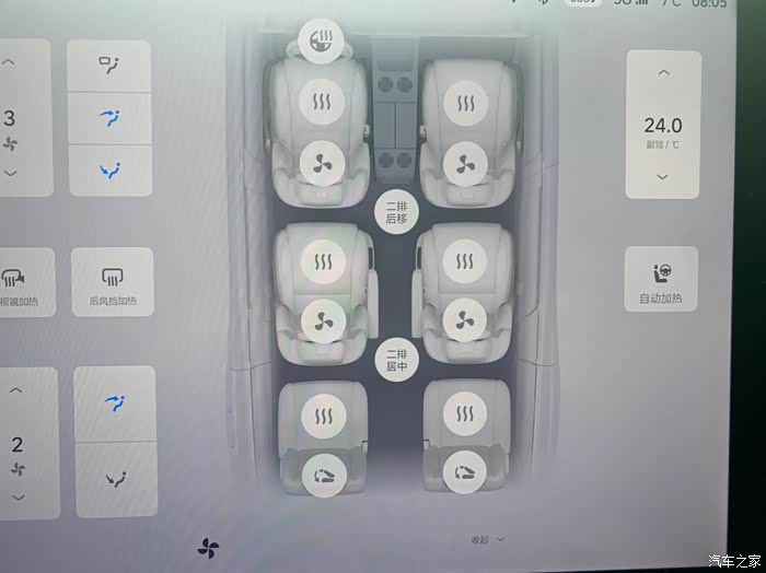 以前的一键复位调整为两个单项,选择性更强了。大多数情况第三排无人坐,可以选择「二排后移」让二排空间最大化,调整后的二排无论是坐感、观影、休息都更佳。一键居中恢复座椅整洁性或者一键后移让二排空间更舒服非常方便。