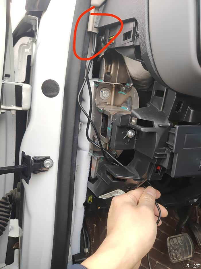 撬开A柱,将记录仪两根黑线顺红线标识走线