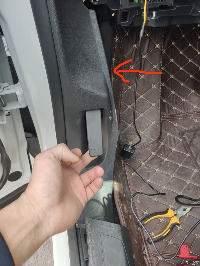 第2步,顺着箭头指示方向拆下左侧挡板。方便一会走线 搭铁 并测试记录仪功能是否正常,切记先不要顶棚 A柱 走线。