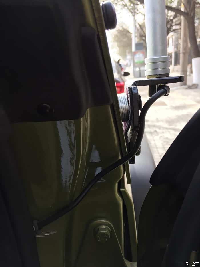 牧马人天线支架28元网购,角磨机切掉左边原来的安装孔,在下孔垂直线左倾30度,重新打孔,孔径10毫米、孔距55毫米……