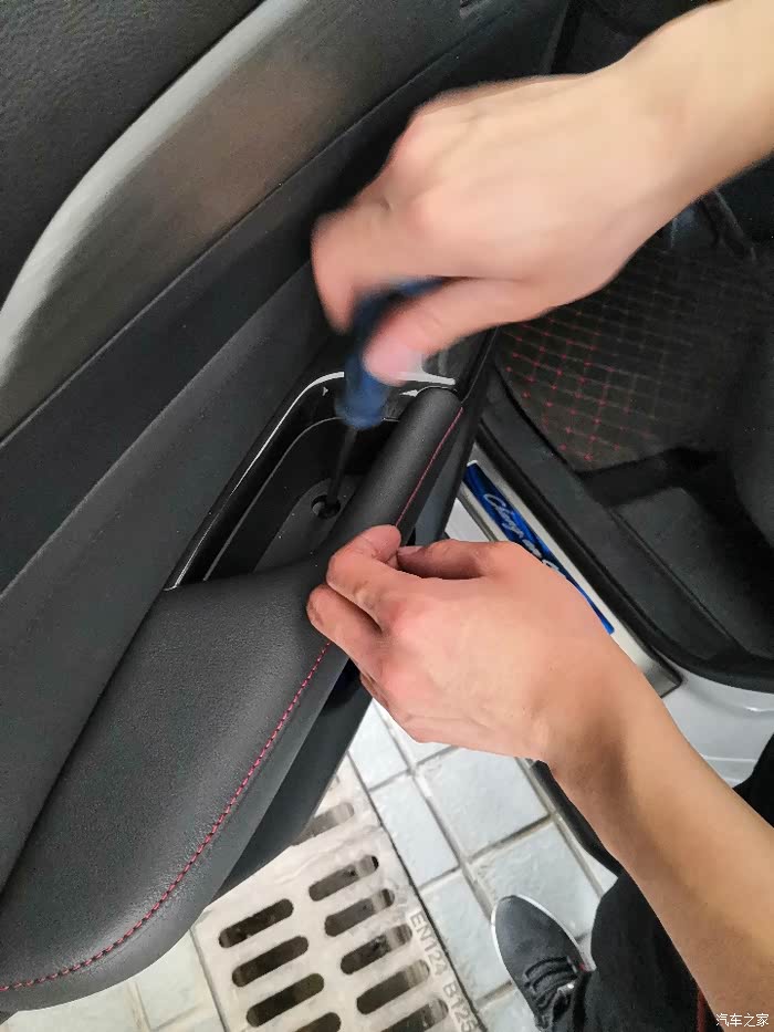 我车从来没有过拆卸,也不知道具体哪地方有螺丝。经过观看才知道第一个螺丝隐藏在门把手后面。